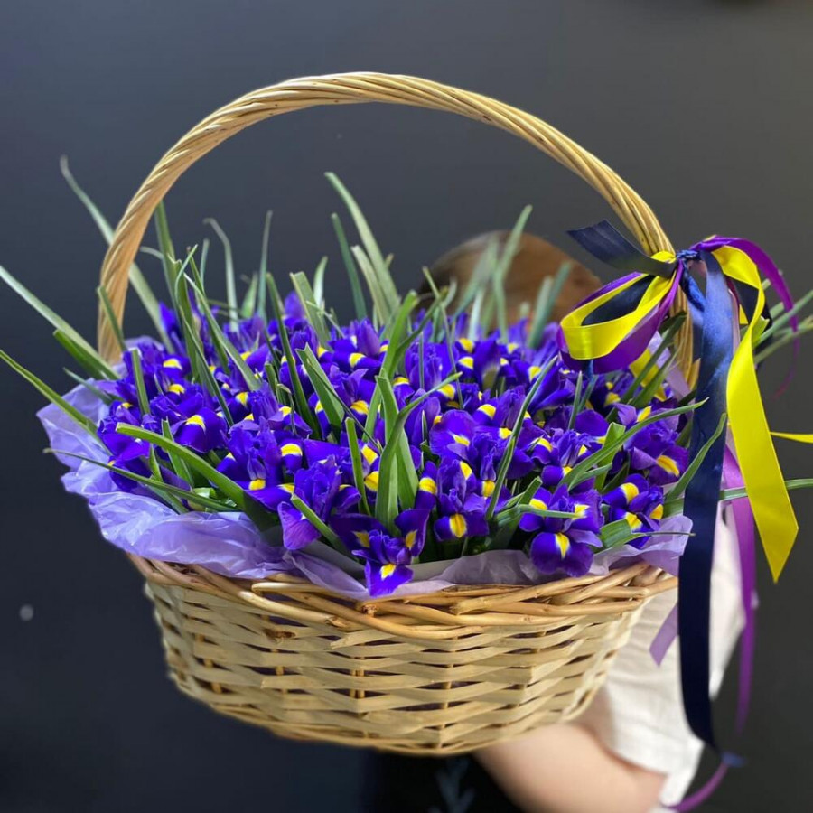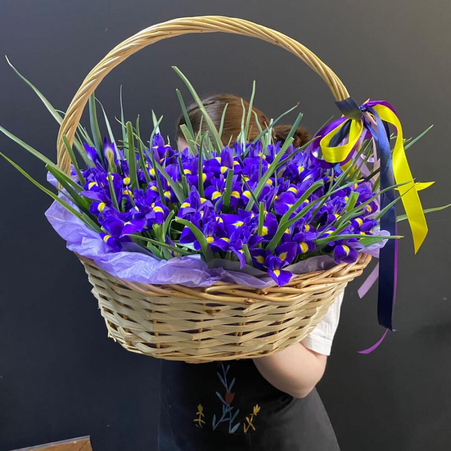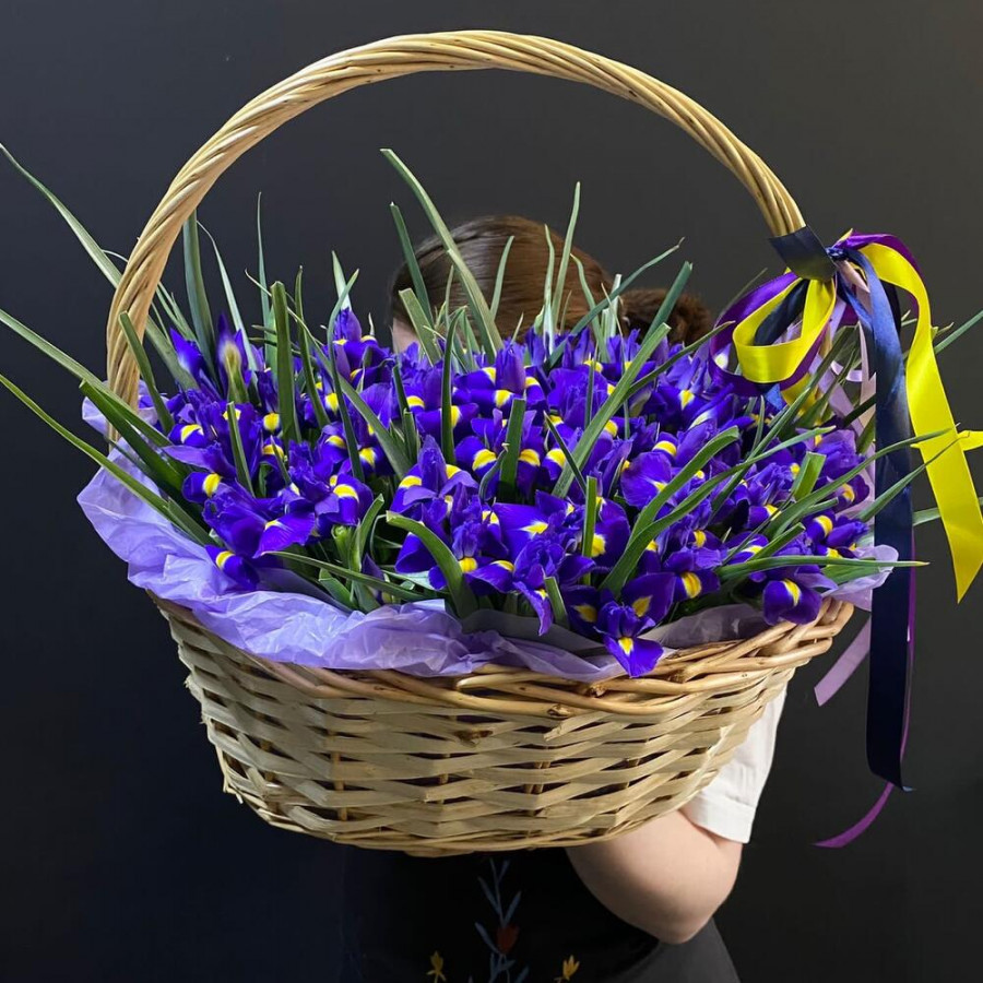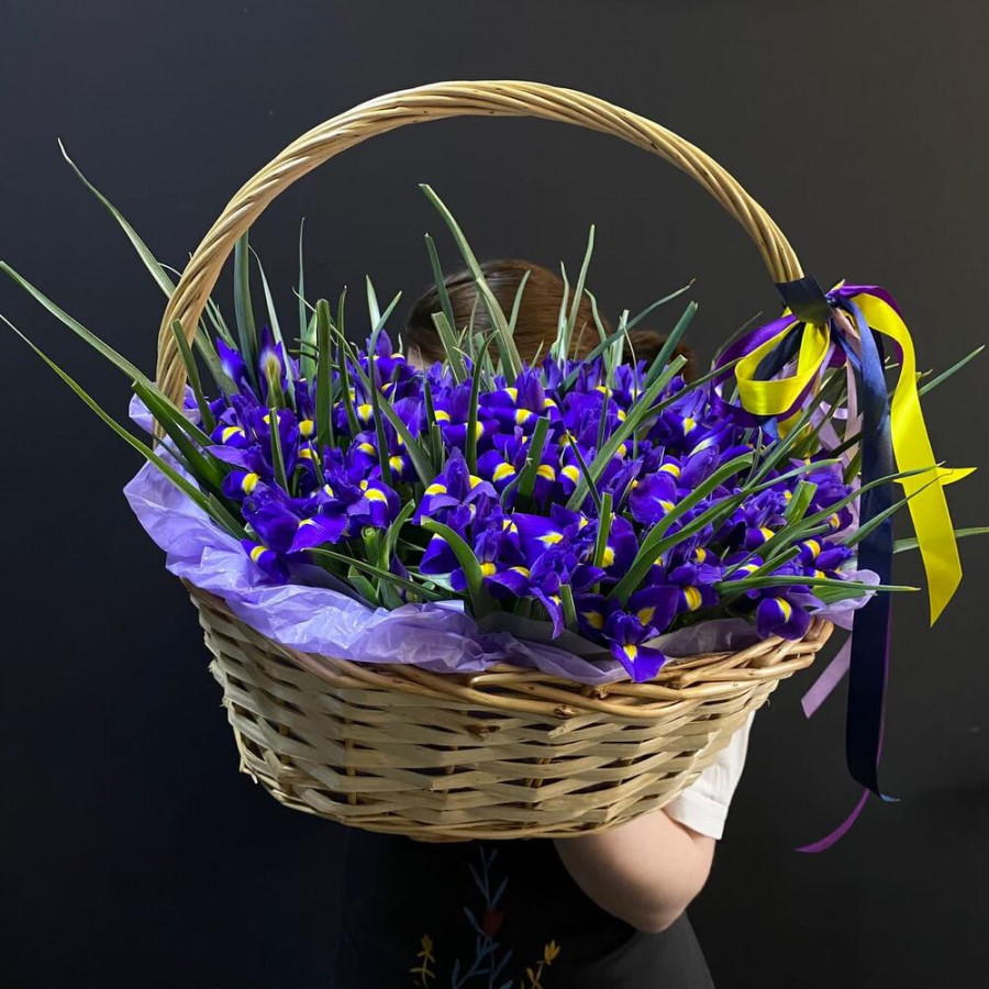 На фото 101 синий ирис в плетенной корзине. В составе: ирис 101 шт, корзина (xl) 1 шт, оазис флористический 3 шт, . Все цветы свежие и ароматные, букет красиво оформлен и отлично подходит для подарка. Доступна доставка цветов или самовывоз.