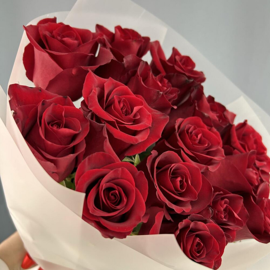 На фото букет из 15 бордовых роз. В составе: роза 15 шт, дизайнерская упаковка 1 шт, атласная лента 1 шт, . Все цветы свежие и ароматные, букет красиво оформлен и отлично подходит для подарка. Доступна доставка цветов или самовывоз.