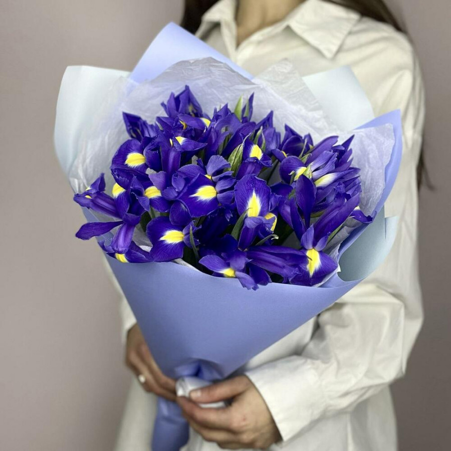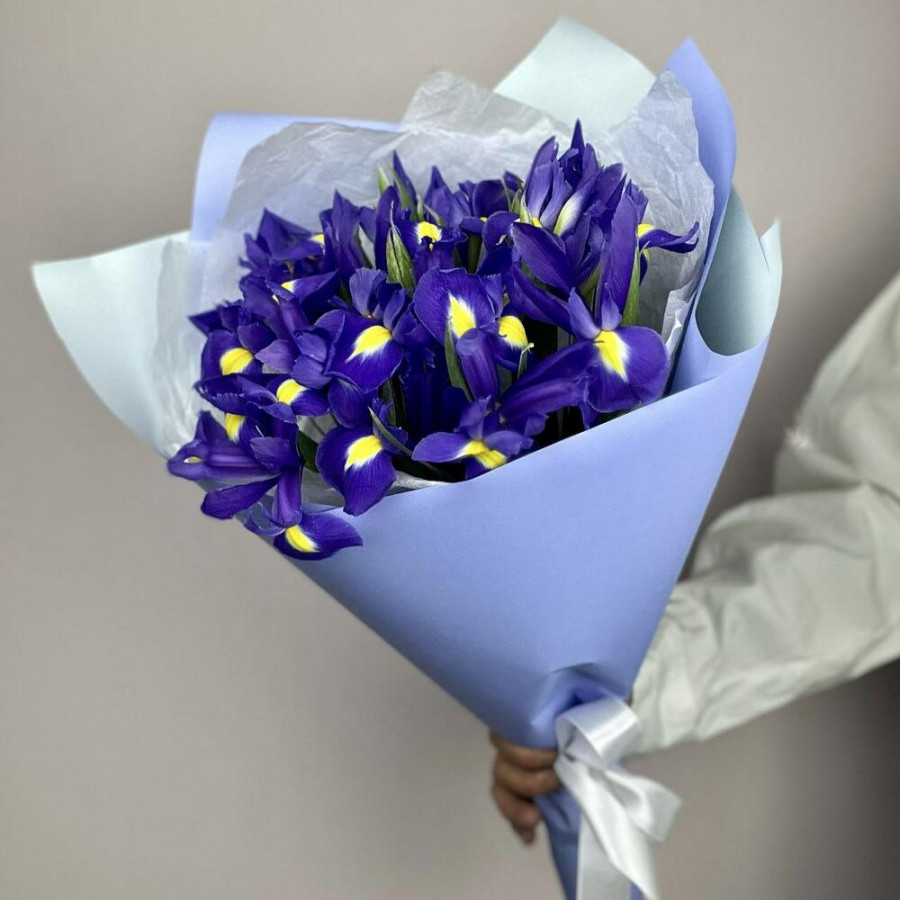 На фото букет из 15 синих ирисов. В составе: ирис 15 шт, дизайнерская упаковка 1 шт, атласная лента 1 шт, . Все цветы свежие и ароматные, букет красиво оформлен и отлично подходит для подарка. Доступна доставка цветов или самовывоз.