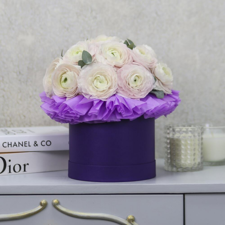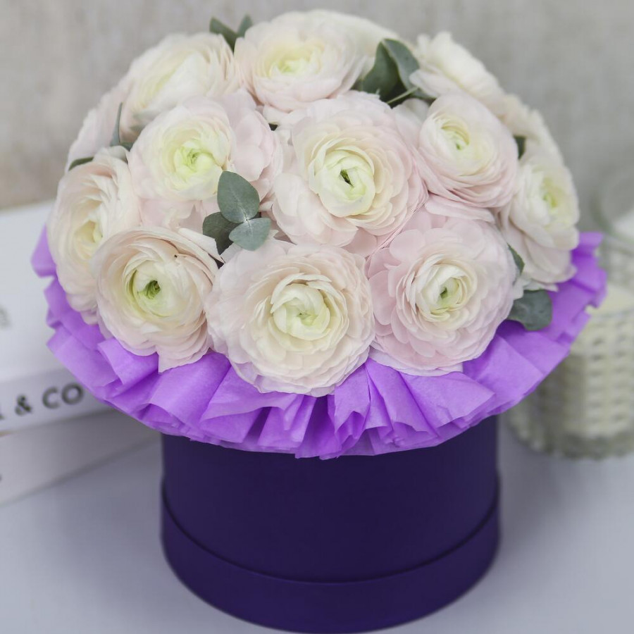 17 белых ранункулюсов в шляпной коробке в Суворове