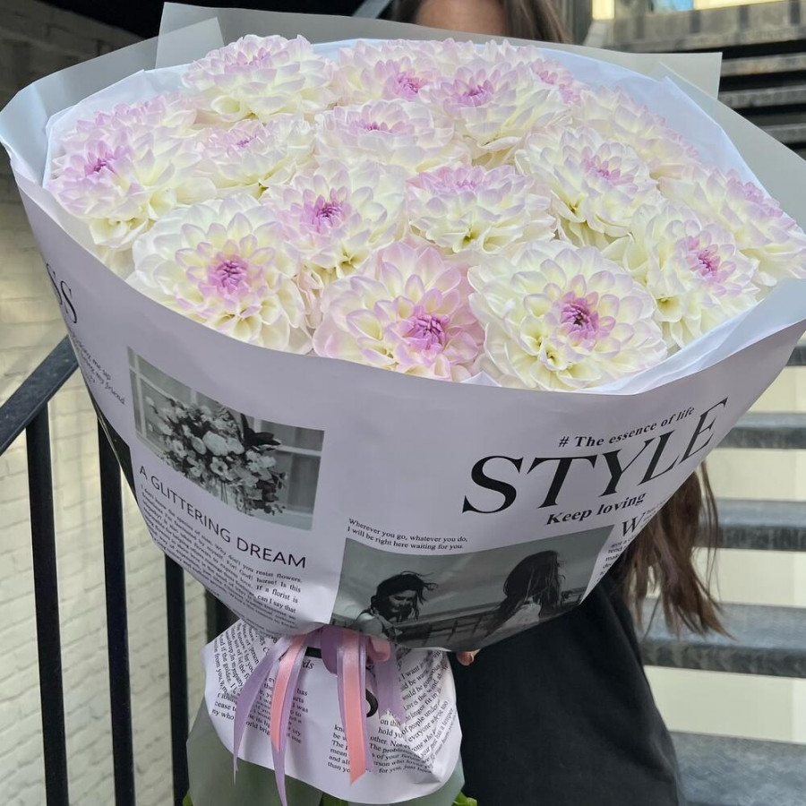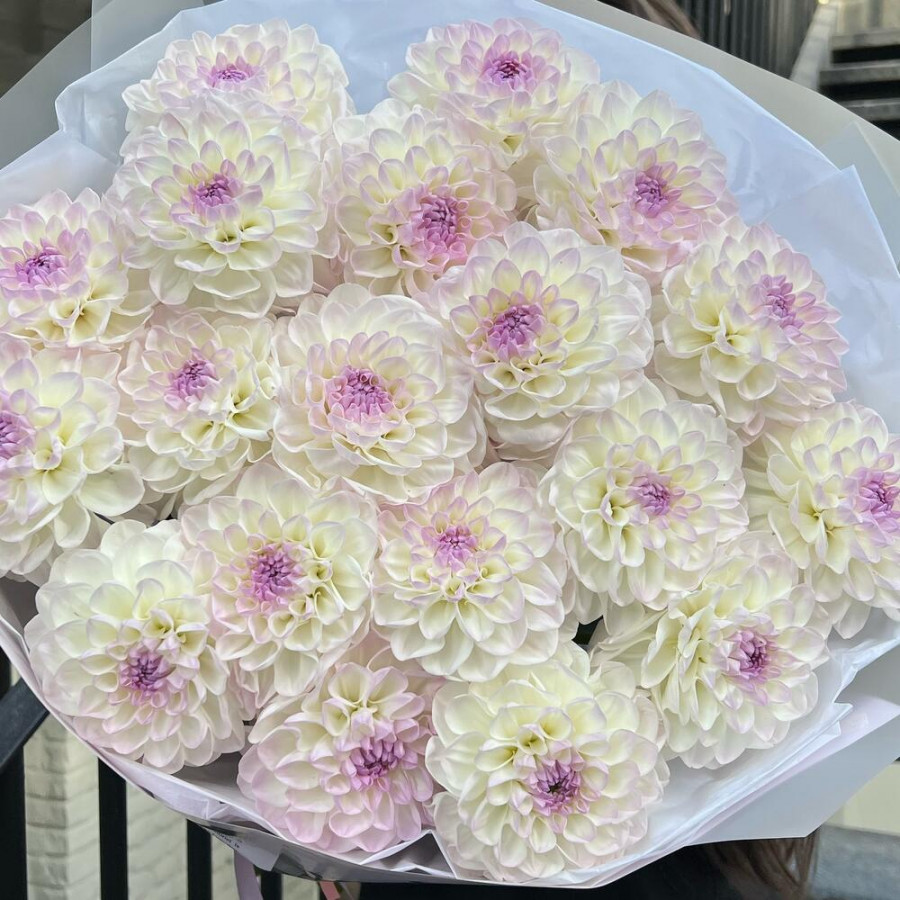 На фото букет из 19 бело-лиловых георгин. В составе: георгина 19 шт, дизайнерская упаковка 1 шт, атласная лента 1 шт, . Все цветы свежие и ароматные, букет красиво оформлен и отлично подходит для подарка. Доступна доставка цветов или самовывоз.