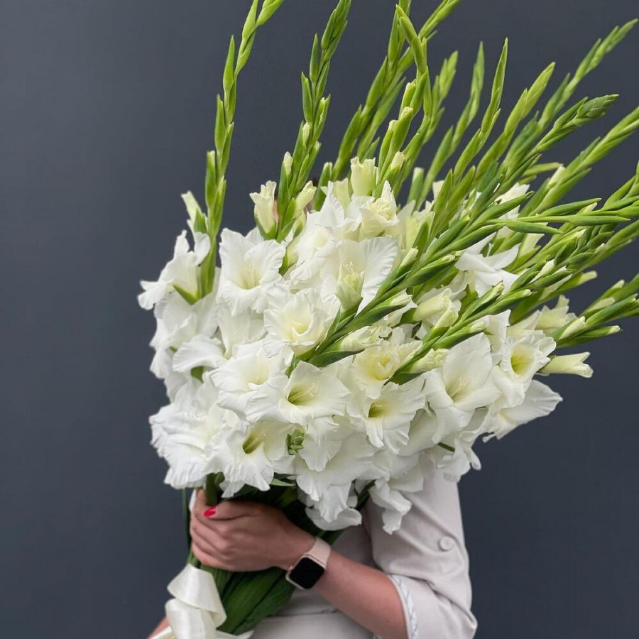 На фото букет из 19 белых гладиолусов. В составе: гладиолус 19 шт, атласная лента 1 шт, . Все цветы свежие и ароматные, букет красиво оформлен и отлично подходит для подарка. Доступна доставка цветов или самовывоз.