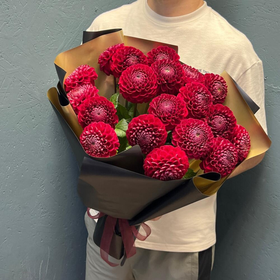На фото букет из 19 красных георгин. В составе: георгина 19 шт, крафт-бумага 1 шт, атласная лента 1 шт, . Все цветы свежие и ароматные, букет красиво оформлен и отлично подходит для подарка. Доступна доставка цветов или самовывоз.