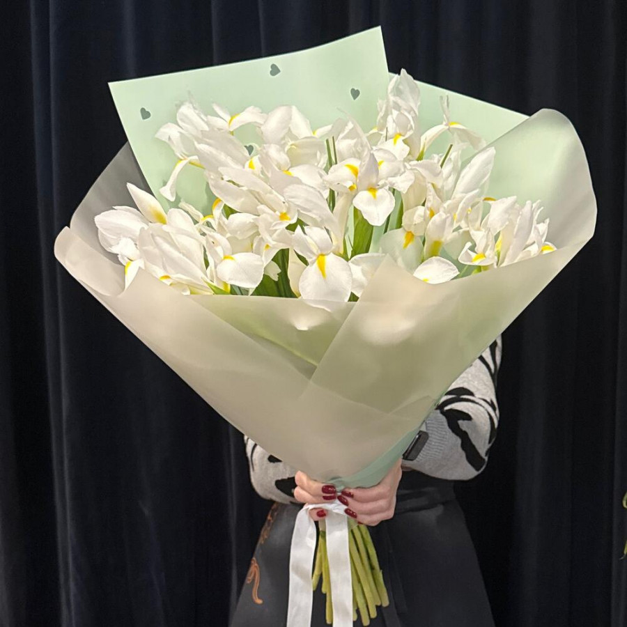 На фото букет из 23 белых ирисов. В составе: ирис 23 шт, атласная лента 1 шт, дизайнерская упаковка 1 шт, . Все цветы свежие и ароматные, букет красиво оформлен и отлично подходит для подарка. Доступна доставка цветов или самовывоз.