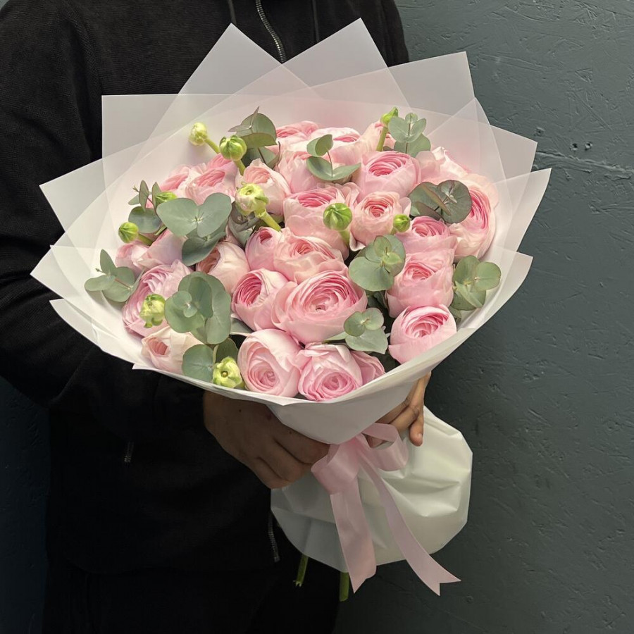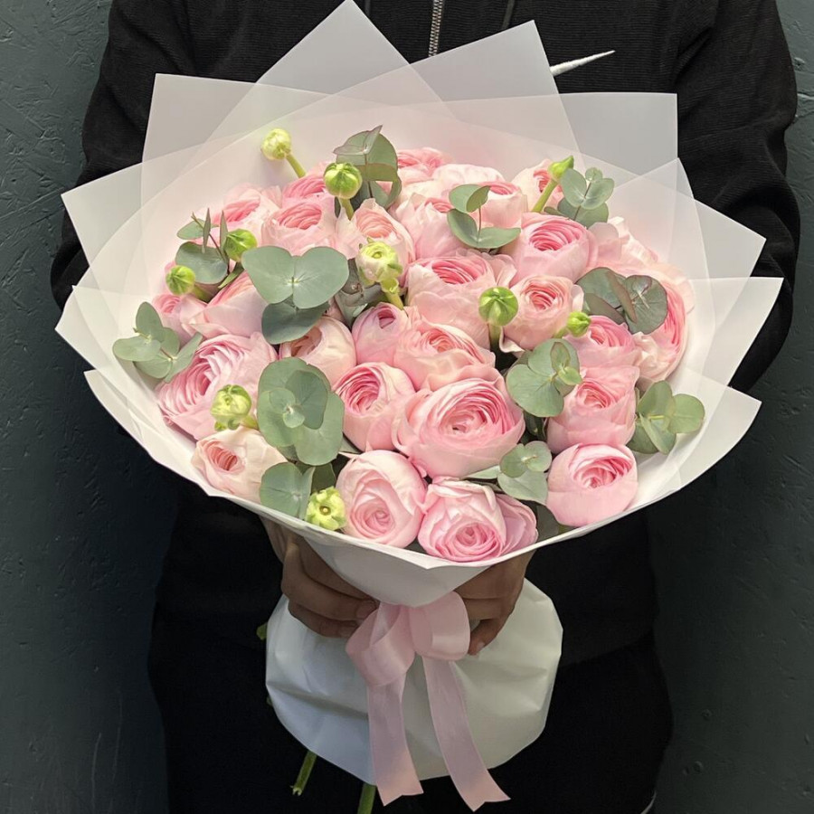 Букет из 29 розовых ранункулюсов с эвкалиптом в Суворове