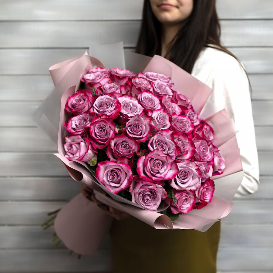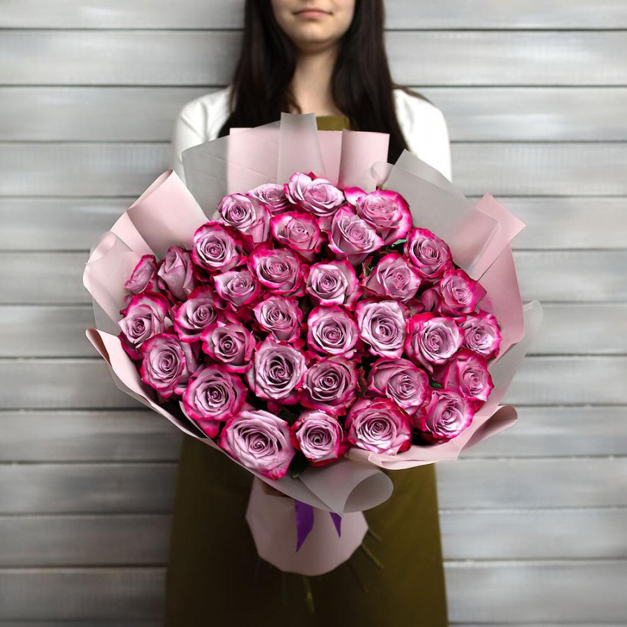 На фото букет из 33 фиолетовых роз. В составе: роза 33 шт, дизайнерская упаковка 1 шт, атласная лента 1 шт, . Все цветы свежие и ароматные, букет красиво оформлен и отлично подходит для подарка. Доступна доставка цветов или самовывоз.