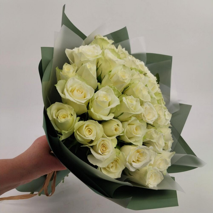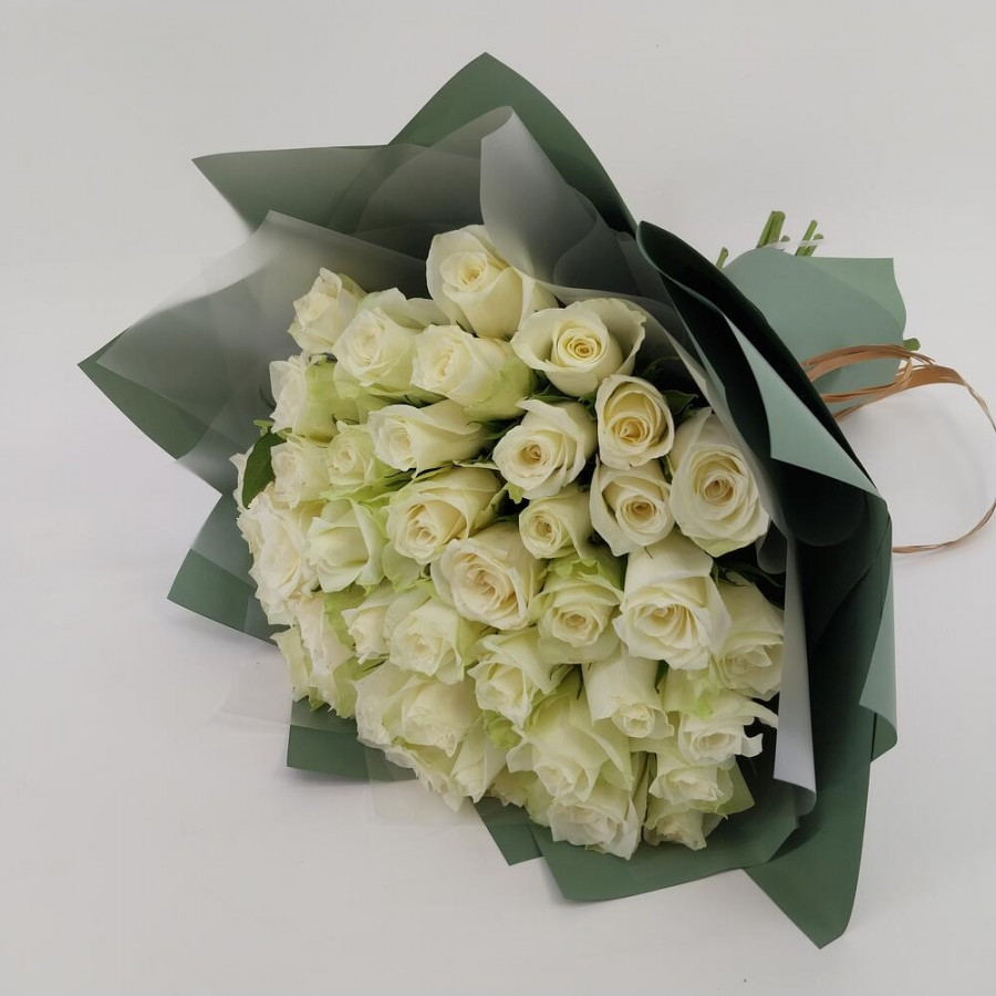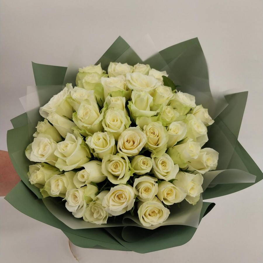 На фото букет из 41 белой розы. В составе: роза 41 шт, дизайнерская упаковка 1 шт, атласная лента 1 шт, . Все цветы свежие и ароматные, букет красиво оформлен и отлично подходит для подарка. Доступна доставка цветов или самовывоз.