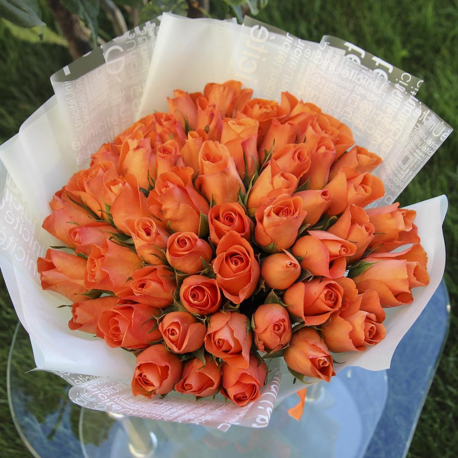 На фото букет из 51 оранжевой розы. В составе: роза 51 шт, дизайнерская упаковка 2 шт, атласная лента 1 шт, . Все цветы свежие и ароматные, букет красиво оформлен и отлично подходит для подарка. Доступна доставка цветов или самовывоз.