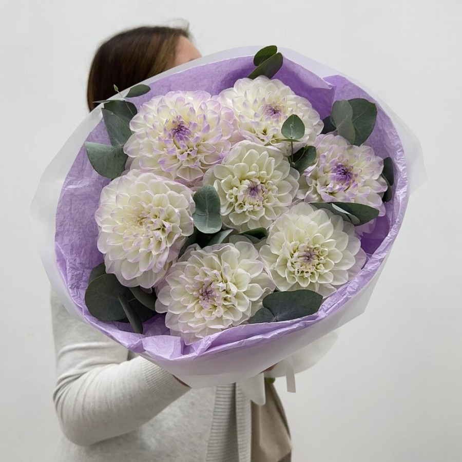 Букет из 7 бело-лиловых георгин с эвкалиптом
