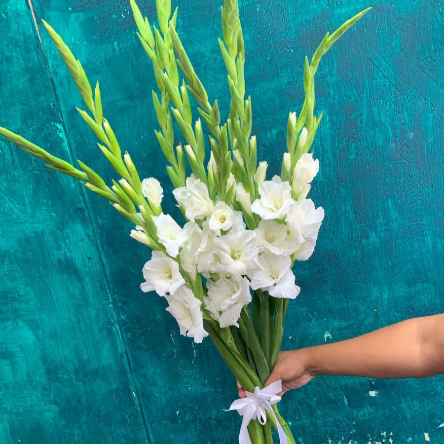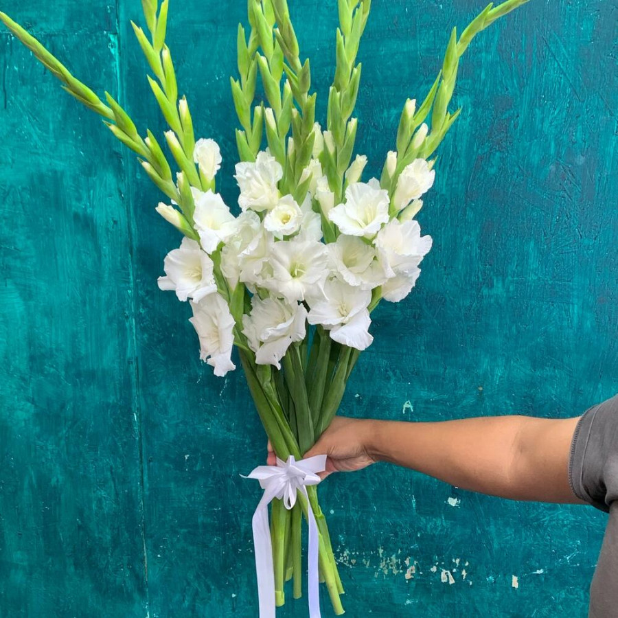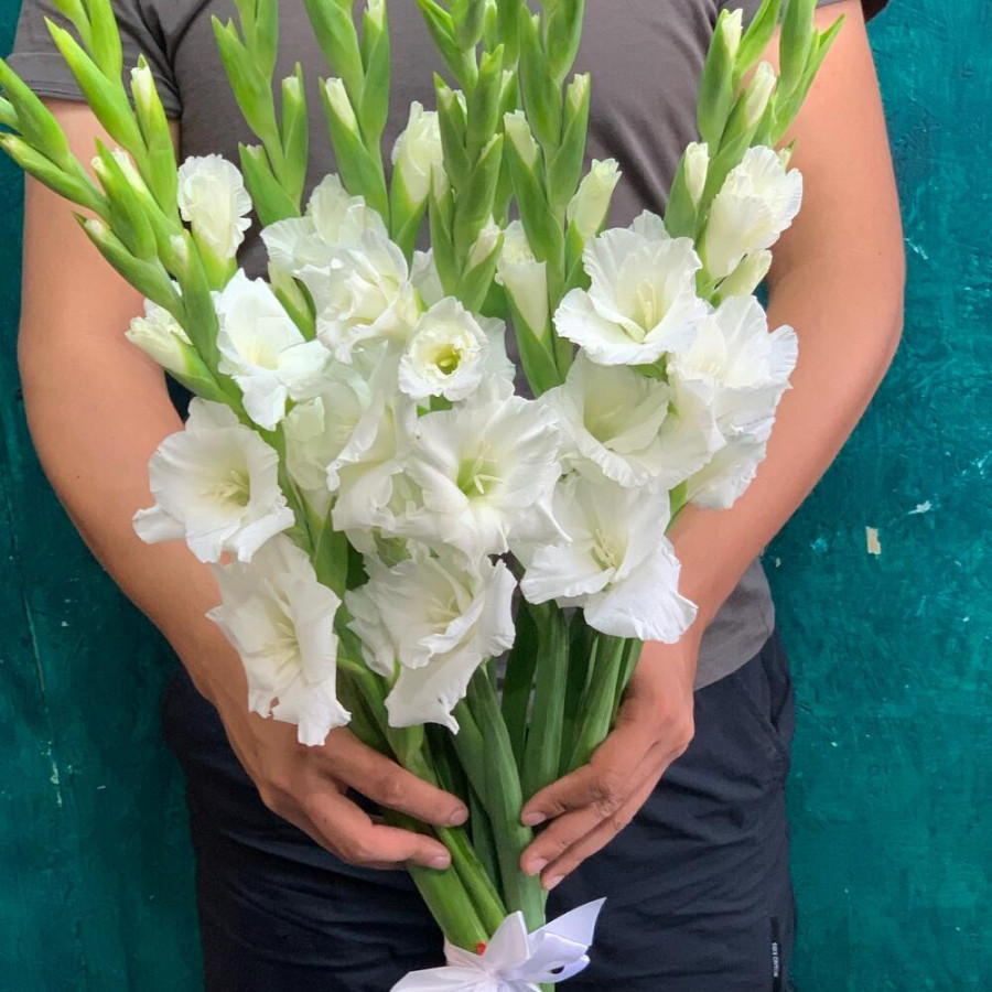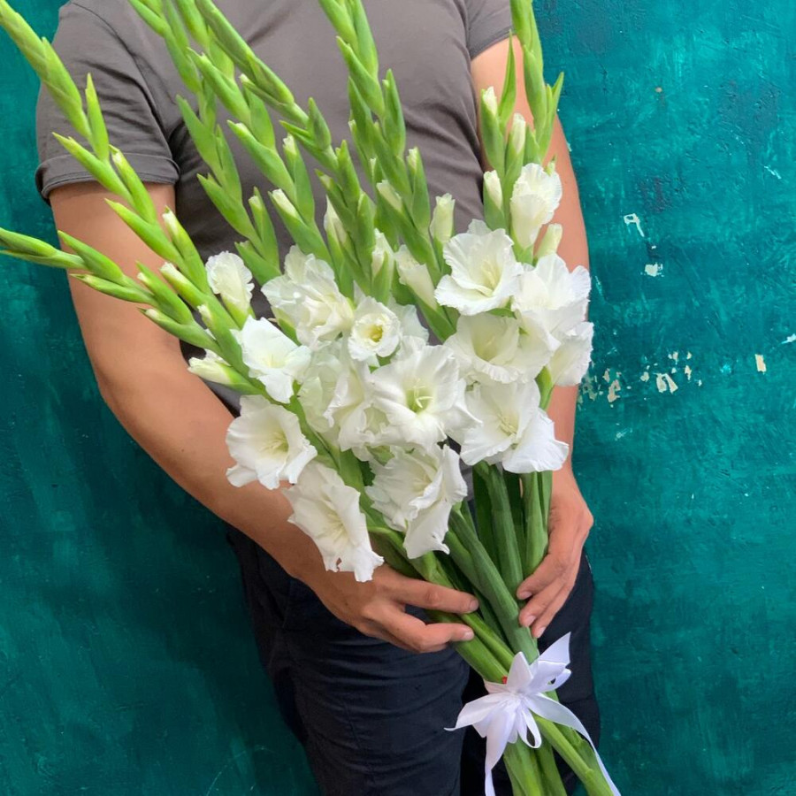 На фото букет из 9 белых гладиолусов. В составе: гладиолус 9 шт, атласная лента 1 шт, . Все цветы свежие и ароматные, букет красиво оформлен и отлично подходит для подарка. Доступна доставка цветов или самовывоз.