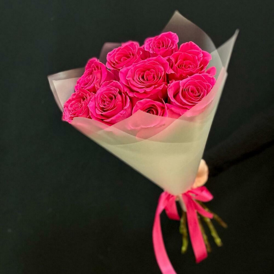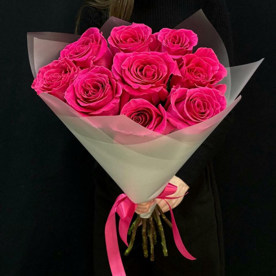 На фото букет из 9 малиновых роз. В составе: роза 9 шт, крафт-бумага 1 шт, атласная лента 1 шт, . Все цветы свежие и ароматные, букет красиво оформлен и отлично подходит для подарка. Доступна доставка цветов или самовывоз.