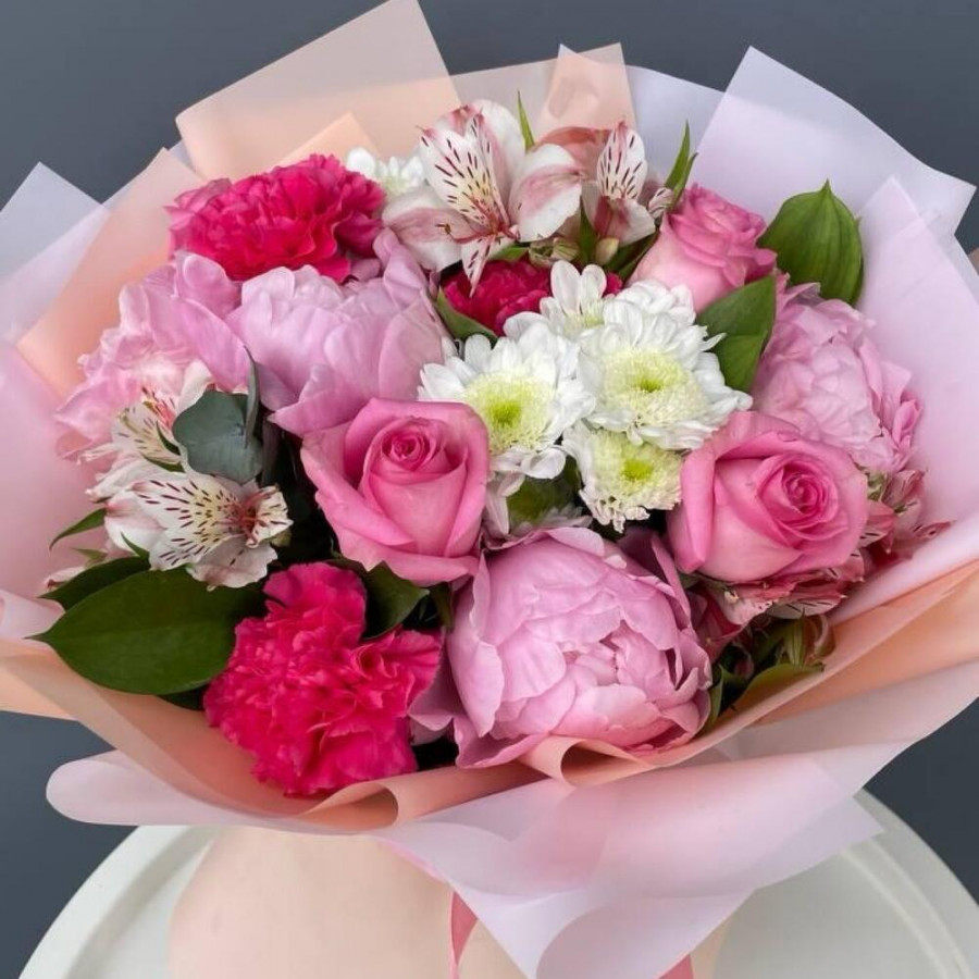На фото букет «игра нежности». В составе: пион 5 шт, хризантема кустовая 2 шт, роза 5 шт, гвоздика 3 шт, рускус 3 шт, дизайнерская упаковка 1 шт, атласная лента 1 шт, . Все цветы свежие и ароматные, букет красиво оформлен и отлично подходит для подарка. Доступна доставка цветов или самовывоз.