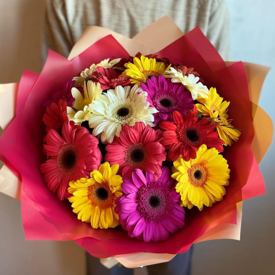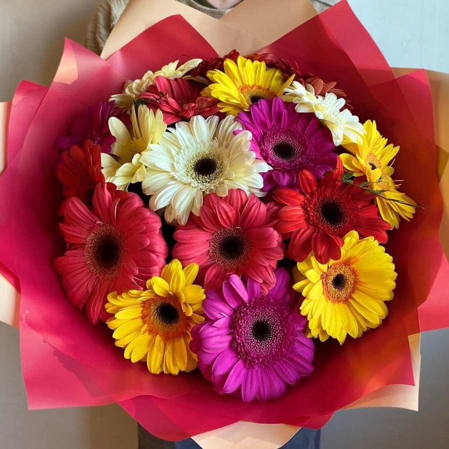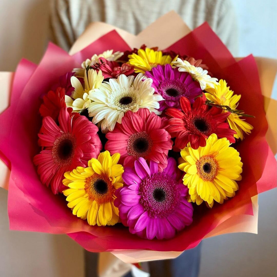 На фото букет из 21 герберы. В составе: гербера 21 шт, крафт-бумага 1 шт, атласная лента 1 шт, . Все цветы свежие и ароматные, букет красиво оформлен и отлично подходит для подарка. Доступна доставка цветов или самовывоз.
