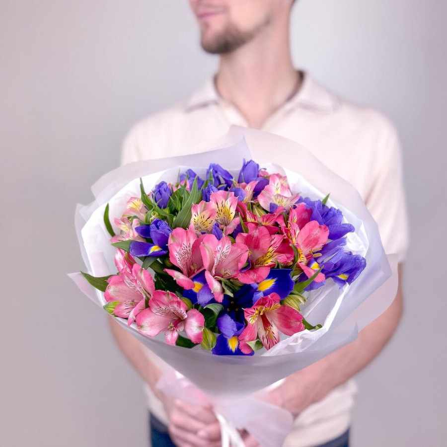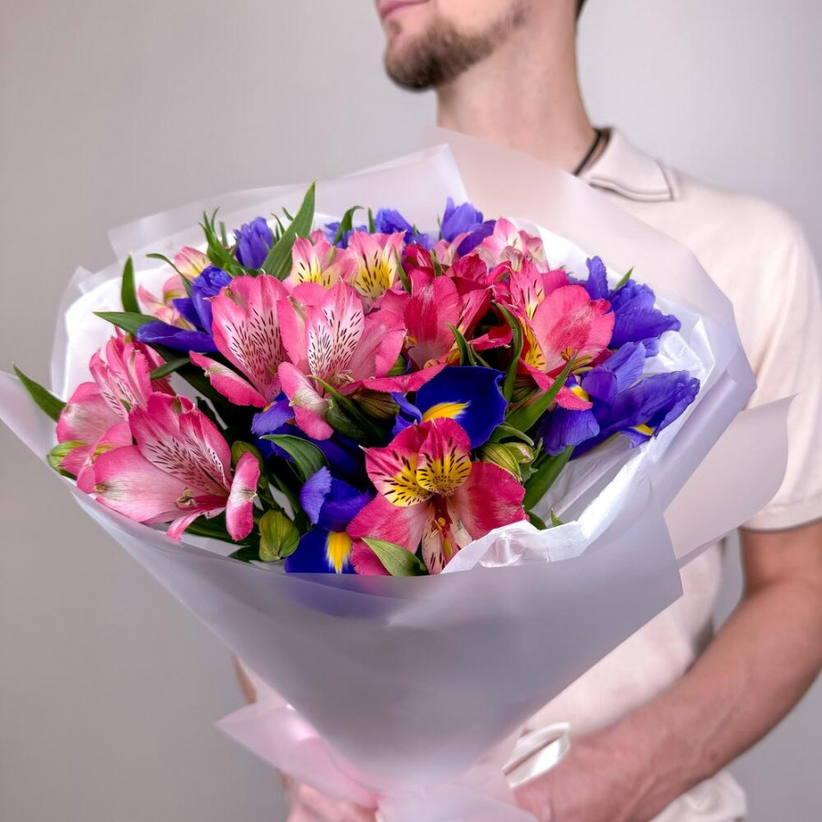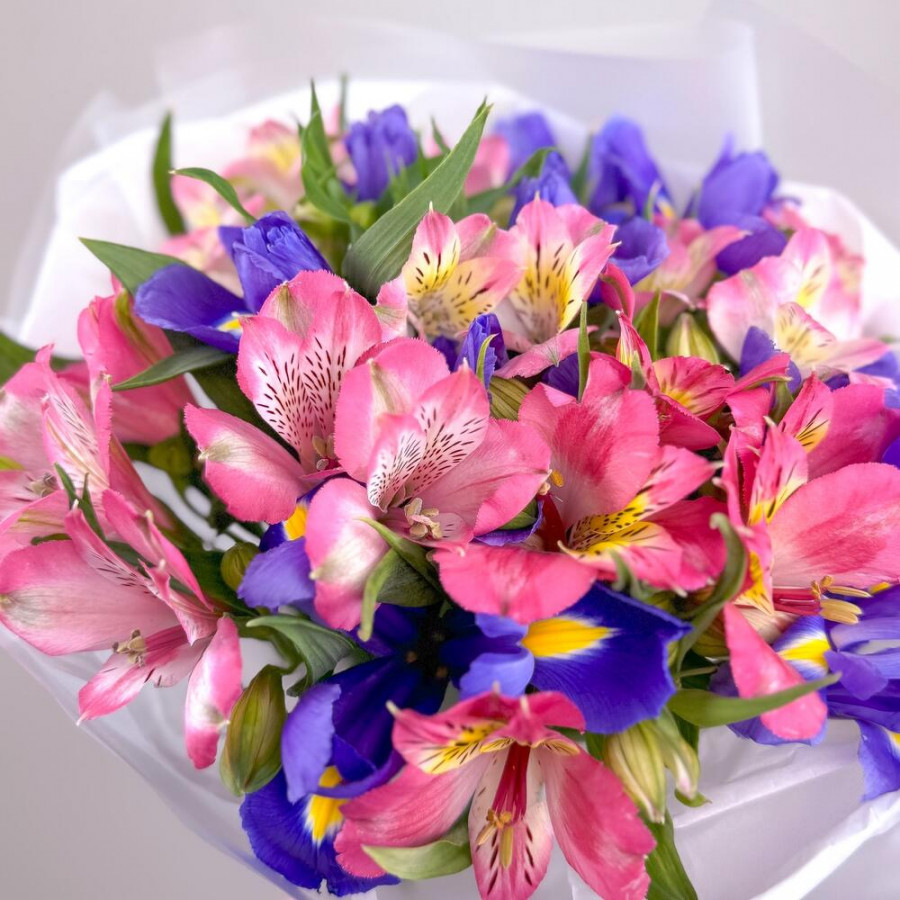Букет из синих ирисов из розовых альстромерий в Суворове