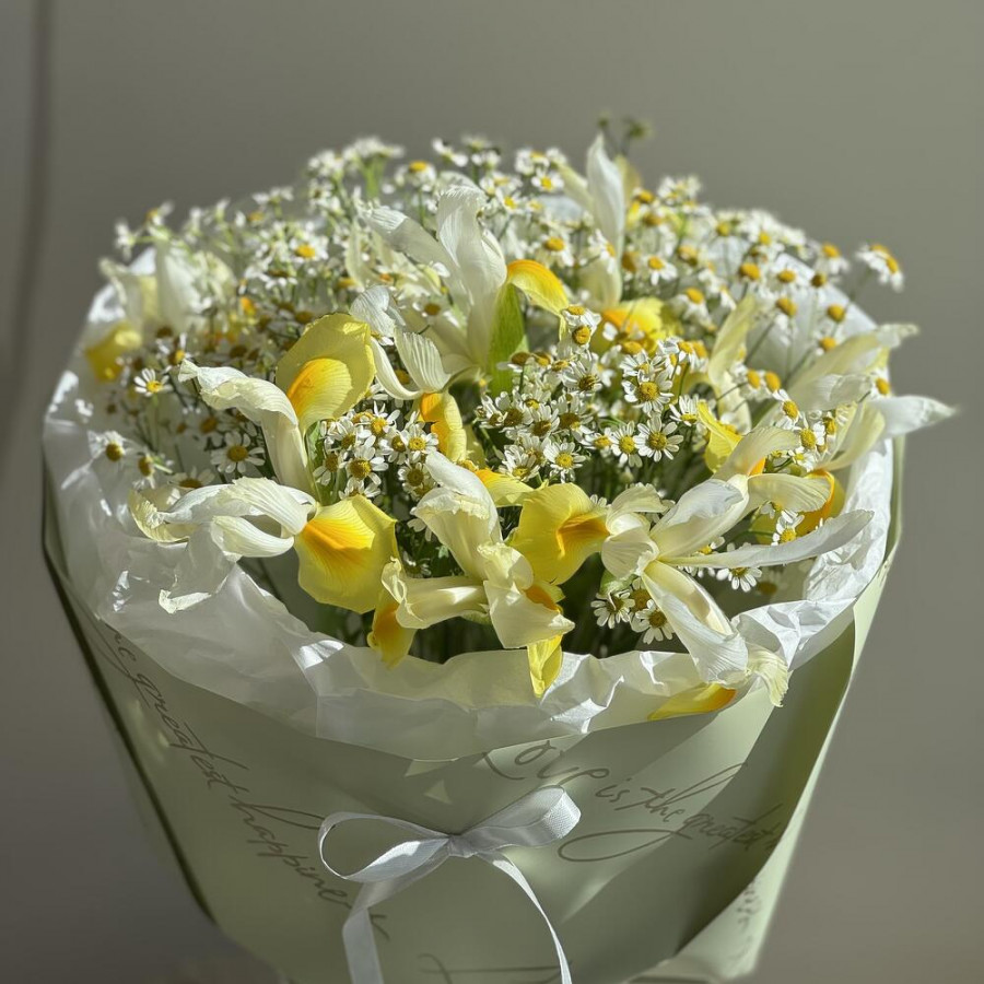 Букет из желтых ирисов и ромашек