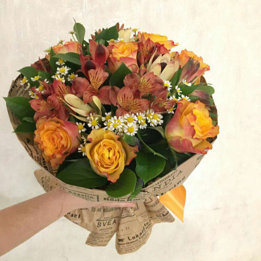 Яркое сочетание оранжевых роз с огненными лепестками, игристых веточек альстромерий и веселых ромашек - танацетума в необычных осенних тонах, несомненно, поднимут настроение получательнице своими красочными оттенками и необычайно утонченными ароматами.