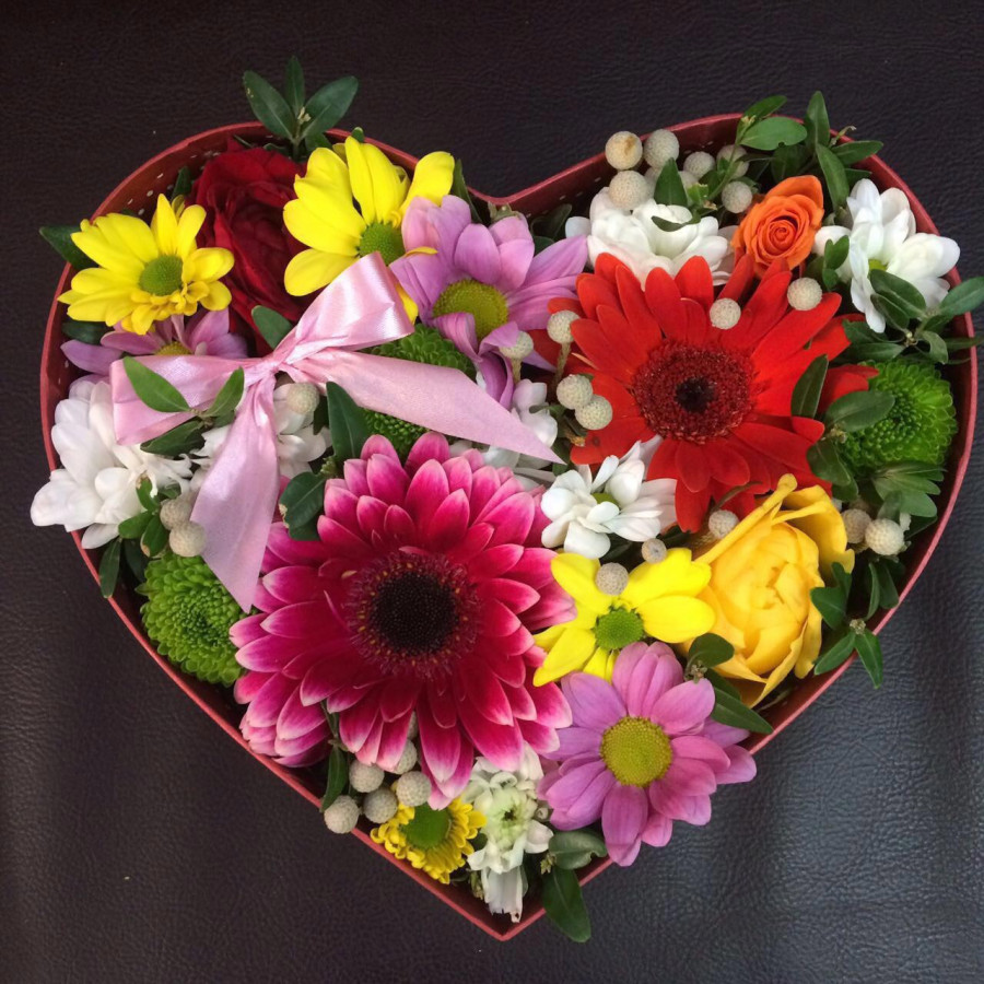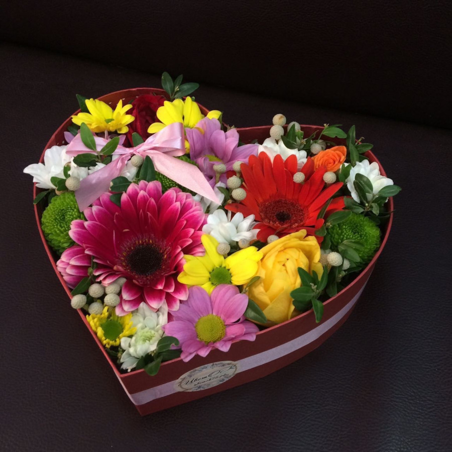 Палитра ярких красок и буйства цветов в оригинальной коробке в форме сердца. Яркие герберы, солнечные хризантемы, ягодки брунии и море тепла и любви в коробочке станут замечательным подарком весёлым и искренним получательницам!