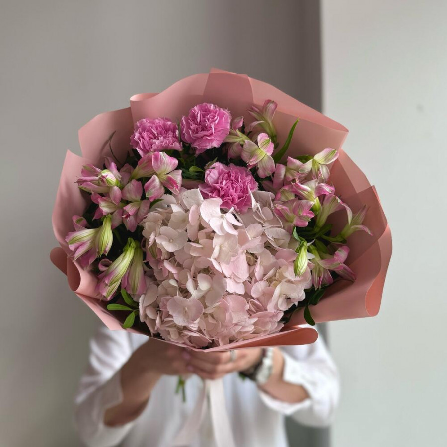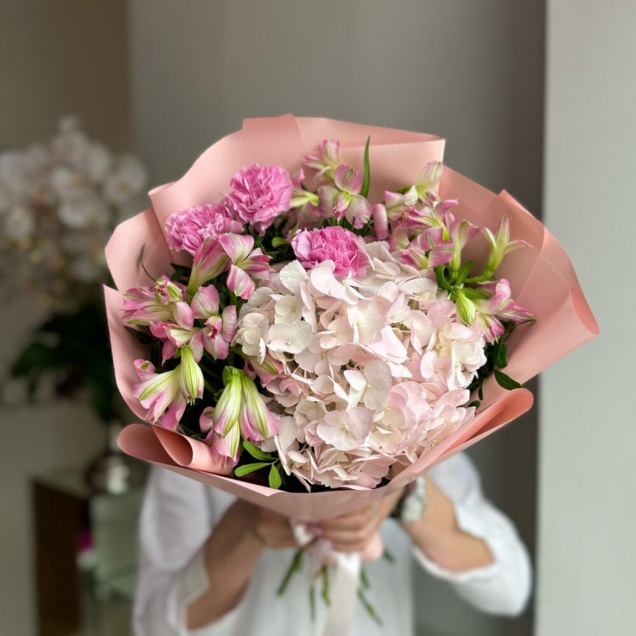 На фото букет «ванильный комплимент». В составе: гортензия 1 шт, альстромерия 4 шт, гвоздика 3 шт, писташ 3 шт, дизайнерская упаковка 1 шт, атласная лента 1 шт, . Все цветы свежие и ароматные, букет красиво оформлен и отлично подходит для подарка. Доступна доставка цветов или самовывоз.