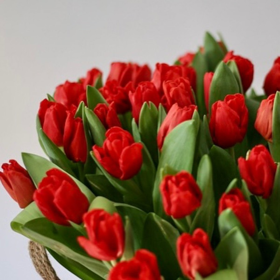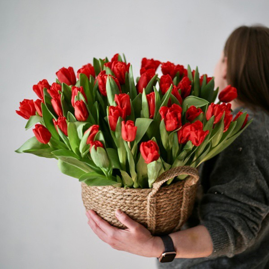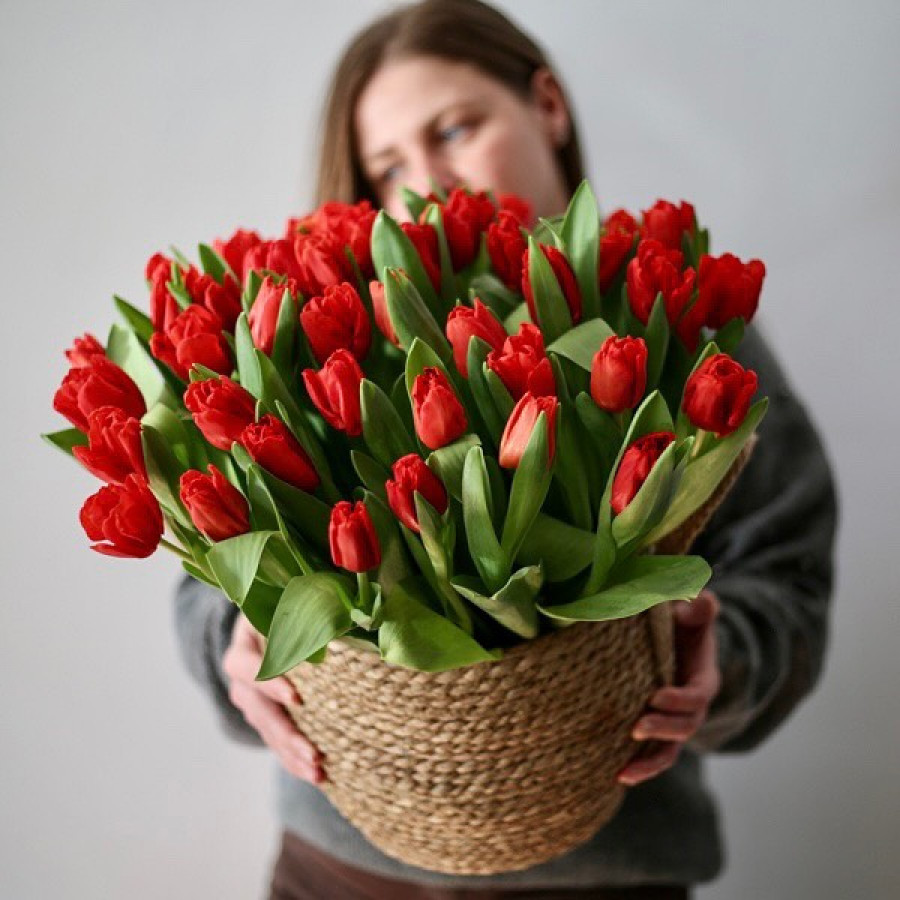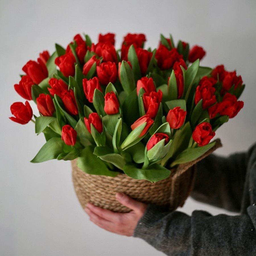 На фото красные тюльпаны в корзине. В составе: тюльпан 43 шт, корзина (l) 1 шт, . Все цветы свежие и ароматные, букет красиво оформлен и отлично подходит для подарка. Доступна доставка цветов или самовывоз.