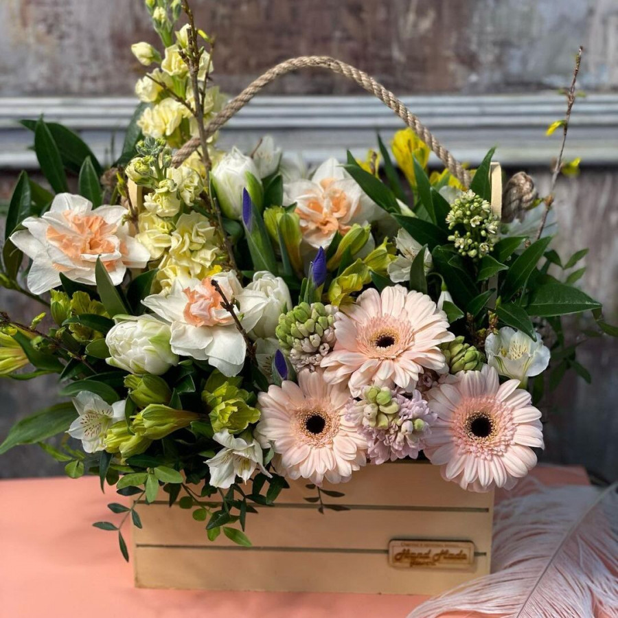 На фото сборная композиция с герберами в ящике. В составе: гербера 3 шт, альстромерия 6 шт, нарцисс 4 шт, гиацинт 4 шт, хамелациум 2 шт, деревянный ящик (s) 1 шт, . Все цветы свежие и ароматные, букет красиво оформлен и отлично подходит для подарка. Доступна доставка цветов или самовывоз.